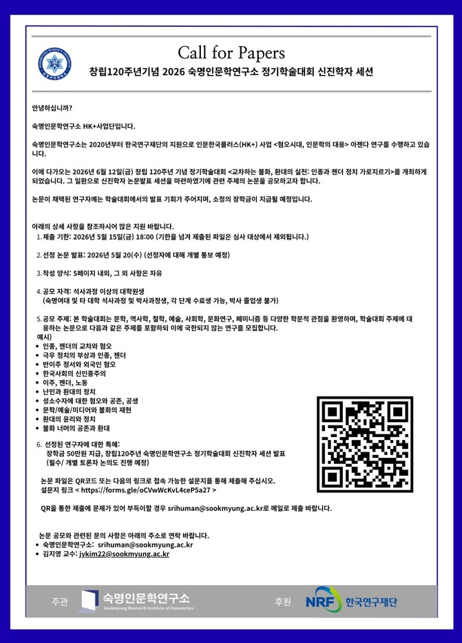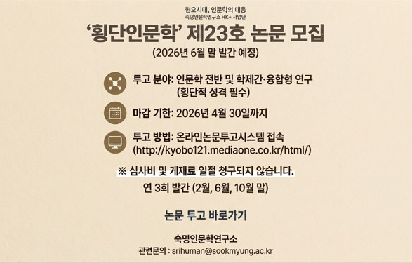 안녕하십니까? 오는 2026년 4월 3일(금), 숙명여대 인문학연구소와 영어영문학부, 그리고 대만 국립양명교통대학교 의료인문학연구센터가 공동으로 주최하는 국제 심포지엄에 대해 안내드립니다.우리는 지금 인공지능(AI) 기술이 급격하게 발전하며 인류와 사회의 근간을 바꾸어 놓는 거대한 변화의 시대를 마주하고 있습니다. 이러한 기술적 전환점 위에서, AI가 문학, 교육, 커뮤니케이션, 그리고 의료 윤리 전반에 미치는 영향을 성찰하는 일은 그 어느 때보다 중요해졌습니다.이번 심포지엄은 기술과 인간, 장애와 돌봄, 그리고 공감이라는 핵심 가치를 바탕으로 AI 시대의 사회적 실천 방안을 비판적으로 논의하고자 마련되었습니다. 국내외 연구자들이 한자리에 모여 의료인문학의 새로운 방향을 모색하는 이번 학술 교류의 장에 여러분의 많은 관심과 참여를 부탁드립니다.숙명여자대학교 인문학연구소 / 영어영문학부국제 공동 심포지엄 <AI 시대의 의료인문학: 연구와 사회적 실천>일시: 2026년 4월 3일(금) 13:30 ~ 18:00장소: 숙명여자대학교 교내 진리관 B102호언어: 전 일정 영어 진행상세 안내: 숙명인문학연구소 홈페이지 참조
